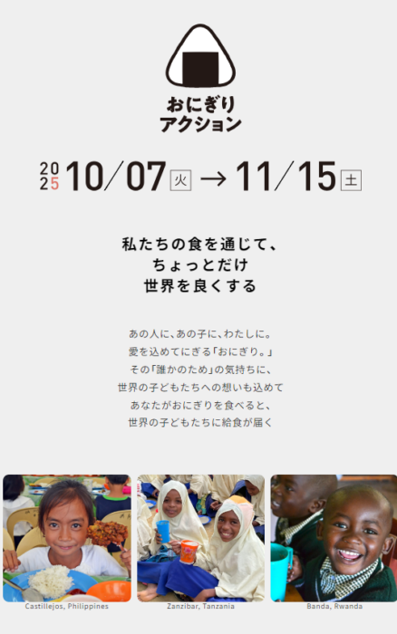 おにぎりにまつわる写真を投稿すると、写真投稿1枚につき 給食5食分 がアジアやアフリカの子供たちに届くというプロジェクトです。