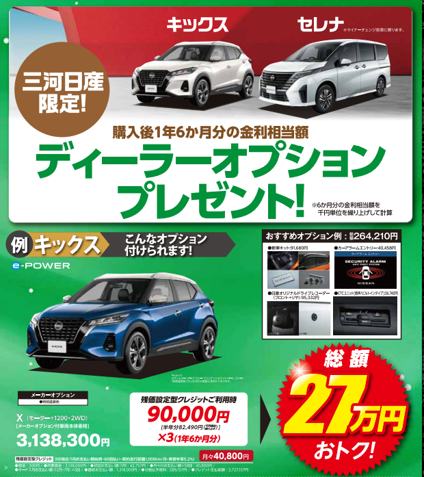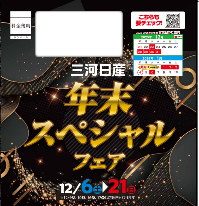 2025年12月04日/日産ギャラリー西尾上町 年末スペシャルフェア こんにちは、西尾上町店です。 12月6日(土)~21日(日)まで三河日産年末スペシャルフェアを開催します 残価設定型クレジットORおまとめプランでご購入の方 三河日産HP https://ni-mikawa.nissan-dealer.jp/top.html お得な特典を多数ご用意しております ぜひ三河日産各店へお越しください ご来店お待ちしております 0読み込み中...
