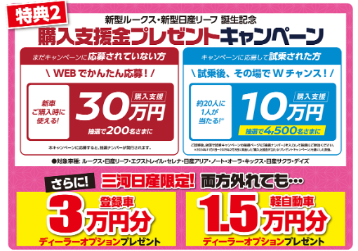 購入支援金プレゼントキャンペーン!さらに三河日産限定で両方外れてもオプションプレゼント![]()