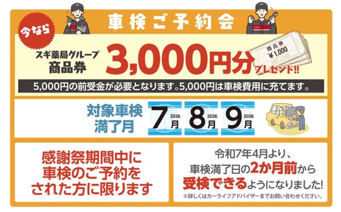感謝祭期間中に車検のご予約をいただいたお客様にスギ薬局商品券3000円分プレゼント![]()