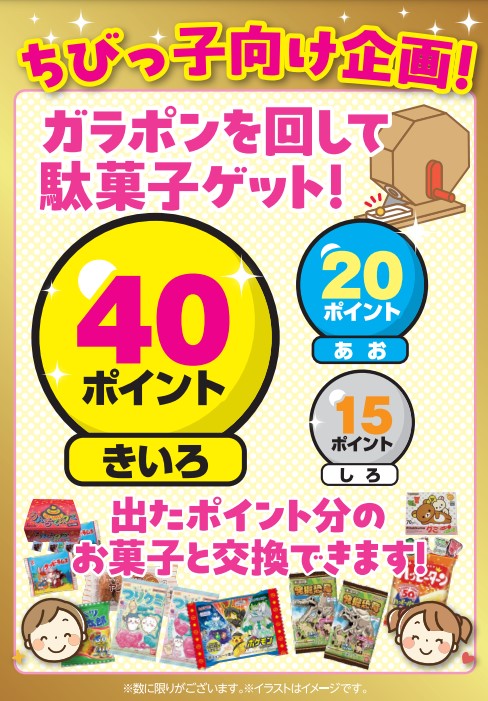 ちびっこのみなさんにお菓子ゲットのガラポンくじもご用意しております![]()